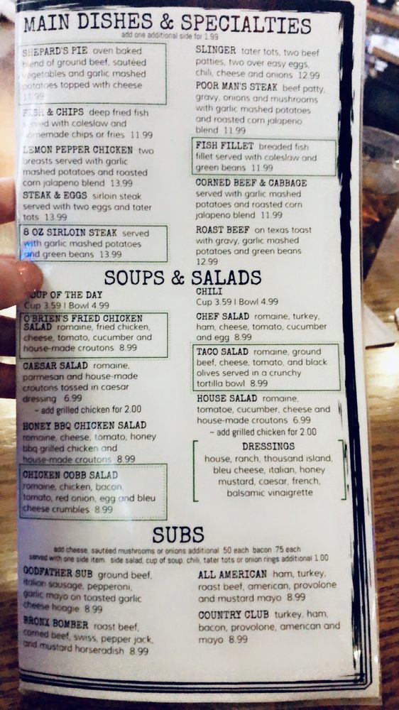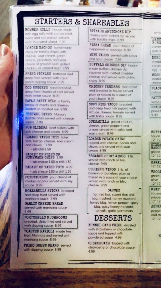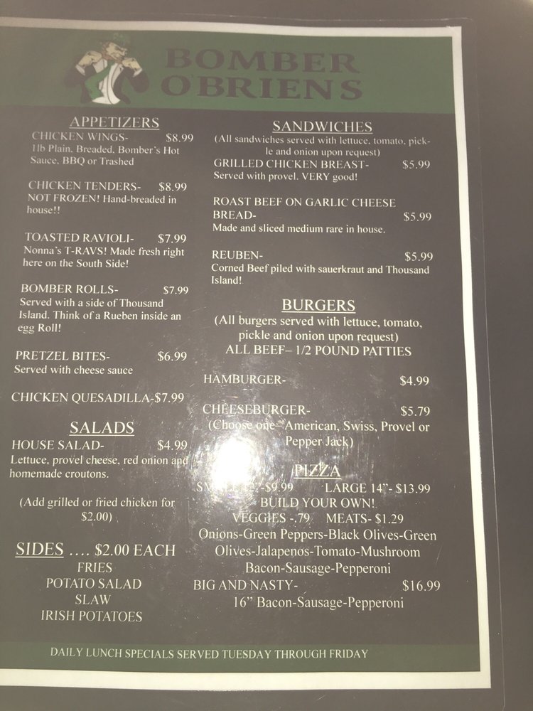 Introducing the menu at Bomber O'Brien's, a bustling joint in Saint Louis known for their burgers and sandwiches. This casual spot offers various utilities like takeout, delivery, and wheelchair access, perfect for groups looking for a lively atmosphere. With an extensive drink menu including Vodka, Gin, and Rum options, there's something for every palate. Customers rave about the friendly staff and vibrant setting, making it a go-to spot for watching games or hanging out with friends. From crispy tater tots to flavorful buffalo wings, the menu features classic bar fare with a twist. While some dishes like sliders may fall short, the strong drinks and overall ambiance make Bomber O'Brien's a must-visit for late-night cravings and weekend gatherings.